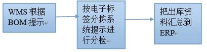 A.由ERP下訂單,審核完工單后,下載到WMS系統,根據BOM表由電子標簽系統提示貨品對應的貨位,方便找到貨品位置,根據及數量掃描LOT出庫。