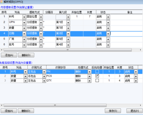 系統(tǒng)提供條碼解析規(guī)則功能,可以對二維碼在系統(tǒng)內(nèi)設(shè)定分短提取規(guī)則。也可以對定義不規(guī)范的條碼進(jìn)行去前后綴處理(如前面包含“PN:”或者后面包含“(PCS)”等),或者僅截取中間某段有效字符.