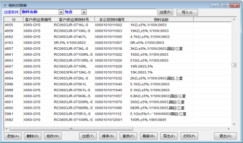 建立物料對照表,將本公司料號與供應(yīng)商料號建立關(guān)聯(lián),來料時通過掃描供應(yīng)商標(biāo)簽打印出內(nèi)部統(tǒng)一格式的標(biāo)簽。物料對照關(guān)系可以是一對多。可以通過 Excel 格式提前導(dǎo)入。