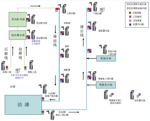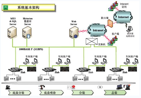 效率科技所提供的MES系統(tǒng)是結合A公司拖拉機生產(chǎn)區(qū)的企業(yè)局域網(wǎng)的總體的規(guī)劃要求、生產(chǎn)管理及調(diào)度流程標準、企業(yè)工藝編碼規(guī)則,建立的一個技術先進適用、運行安全可靠的網(wǎng)絡體系。MES系統(tǒng)通過車體條碼數(shù)據(jù)采集管理,實現(xiàn)車體的實時的流轉(zhuǎn)跟蹤,為保證總裝和分裝線節(jié)拍的一致、了解和調(diào)度車間生產(chǎn)提供了可視化平臺;通過裝配線邊的觸摸屏動態(tài)顯示線上主機的裝配指示,減少錯漏裝現(xiàn)象,提高裝配質(zhì)量;通過對關重件的掃描管理,實現(xiàn)拖拉機生產(chǎn)履歷的及時和準確的記錄,為實現(xiàn)質(zhì)量追溯以及及時召回提供支持;通過對裝配線的啟停記錄和原因統(tǒng)計分析,實際對兩條主裝配線效率的分析。同時,由于A公司拖拉機生產(chǎn)區(qū)是一個全新的運行模式,因此,MES系統(tǒng)充分考慮了系統(tǒng)的開放性與可擴充性的能力,網(wǎng)絡系統(tǒng)能在生產(chǎn)運行過程中,能夠具有不斷摸索、持續(xù)改進、充實完善的能力。
