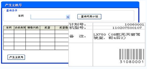 的主機條碼用于后續(xù)工位掃描。該條碼貼在隨車卡上進行流轉(zhuǎn)。產(chǎn)生規(guī)則:按照排序規(guī)則(計劃日期、計劃ID),依次消耗分裝順序計劃來生成主機號