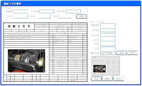 所有生產(chǎn)工位都顯示裝配工藝卡圖片,裝配工藝卡的數(shù)據(jù)維護建立查詢和維護界面。對單個工藝卡數(shù)據(jù)進行維護操作,具體包括新增工藝卡,修改工藝卡和刪除。