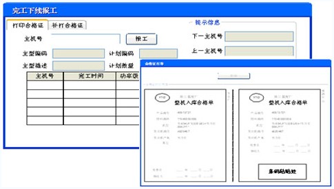 每臺主機下線檢查合格后,需要打印合格證。合格證打印位于質(zhì)檢線后,當主機到達該工位后,操作人員通過選擇主機號碼,確認后系統(tǒng)自動打印出該主機的合格證和主機條碼。