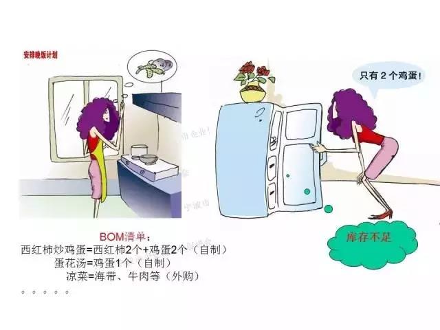 丈夫:“6個人,我們7點左右回來,準備些酒 烤鴨番茄炒蛋 涼菜 蛋花湯。。。。。。,你看可以嗎?”(商務溝通)妻子:“沒問題,我會準備好的,”(訂單確認)妻子記錄下需要做的菜單(主生產計劃),具體要準備的菜:鴨 酒 番茄 雞蛋 食用油。。。。。。(BOM物料清單),發現需要:1只鴨,5瓶酒,4個番茄,。。。。。。,炒蛋需要6個雞蛋,蛋花湯需要4個雞蛋(共用物料)。打開冰箱一看(倉庫),只剩下2個雞蛋(缺料/MRP)。
