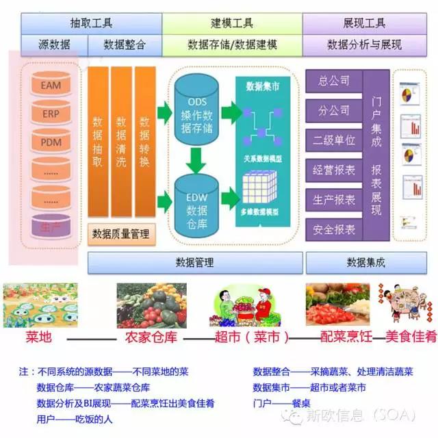 媽媽配菜,媽媽根據(jù)家人一天要吃的菜肴規(guī)劃,挑選各種各樣的菜、肉組合在一起,有的直接可以食用,有的需要再加工,即烹調(diào),然后端出來擺到餐桌上,家人只需要帶一張嘴即可享用,對(duì)BI項(xiàng)目來說,就是報(bào)表的制作過程,業(yè)務(wù)分析人員,根據(jù)領(lǐng)導(dǎo)的要求,按照各個(gè)主題需求,從各個(gè)數(shù)據(jù)立方體中、或者一部分從數(shù)據(jù)倉(cāng)庫(kù)中取一些數(shù)據(jù)組合起來,并且定義展現(xiàn)方式,即把報(bào)表做好,發(fā)布出來,放到門戶上,給與權(quán)限控制,哪些人可以享用這桌美味,這就是報(bào)表制作這個(gè)階段干的事情,所以說,業(yè)務(wù)人員是否可以拖拽制作報(bào)表,關(guān)鍵看前面的數(shù)據(jù)立方體準(zhǔn)備好沒有,相當(dāng)于是這樣的,不是人人都是烹調(diào)高手,但是超市里面有很多配好的菜(蔥姜蒜都有了),你只要拿回去放放鍋里炒5分鐘或者蒸煮10分鐘,端出來即可,不難吧。至于加工的工具是微軟家的鍋還是IBM家的灶,或者oracle家的飄,有什么關(guān)系呢,這些都是報(bào)表制作工具(烹調(diào)工具而已)。