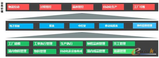根據業務流程以及各流程之間的關系,確定了美的產品化MES平臺的業務應用框架藍圖。以實現物流拉動、過程管控、品質管控、自動化生產、工廠可視的業務價值。MES平臺形成十大業務應用功能模塊,并實現模塊間緊密集成,達到支撐業務高效運作的目標。