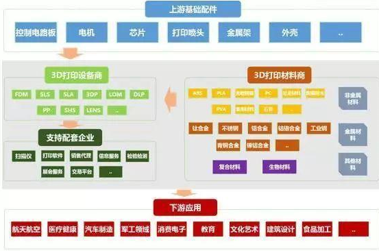 整個3D打印行業產業鏈大概可分為三個部分,上游基礎配件行業,3D打印設備生產企業、3D打印材料生產企業和支持配套企業,下游主要是3D打印的各大應用領域。通常意義上的3D打印行業則主要是指3D打印設備、材料及服務企業。