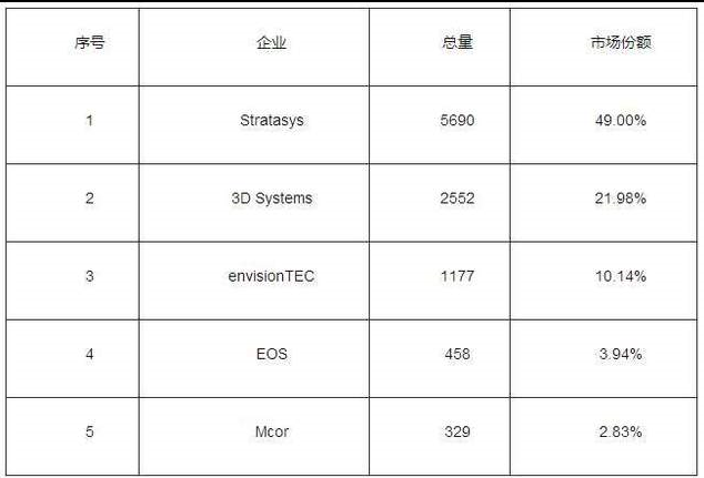 圖表:2015年全球工業級/專業級3D打印設備出貨量TOP5企業
