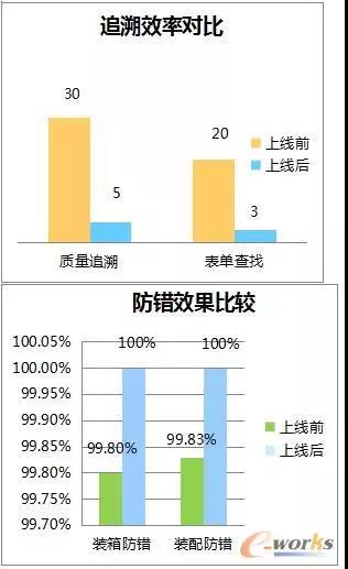 通過物料條碼化管理,裝箱時采用PDA掃描裝箱件,自動核對裝箱清單,防止裝箱錯誤,實現裝配防錯功能(相同圖號不同作業的關鍵件外觀結構相似度高),裝箱準確率到達100%,錄入收集數據,提高工作效率,并實現無紙化管理,提高查詢和分析效率,追溯效率用時80%。